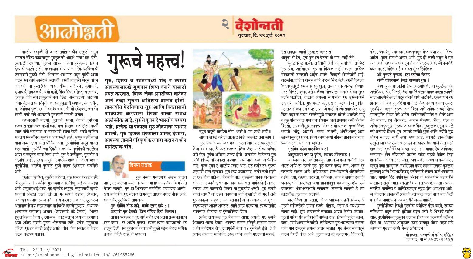 दिशा जिस से पहचाने संसार सारा' हे गीत सादर केले. देवेंद्र खरटमळ यांनी आपल्या कवितेतून गुरुच्या अपार महिमाचे गुणगान सादर केले.